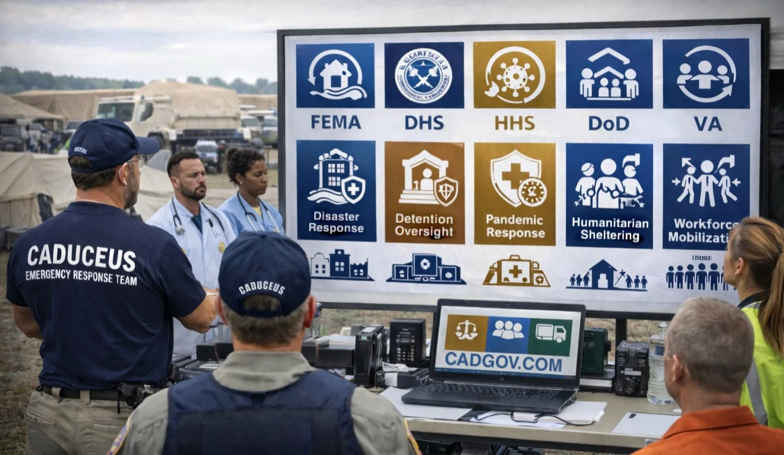 Caduceus supports federal agencies operating in high-risk, high-consequence mission domains, including disaster response, detention oversight, emergency intake operations, pandemic response, humanitarian sheltering, medical surge operations, and workforce mobilization.